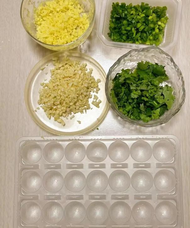 平时懒得每天弄这些葱姜蒜的,其实可以把葱姜蒜切成末,再把它们放进汤圆盒里面,冷冻起来,这样炒菜的时候拿出来一块就可以了。
