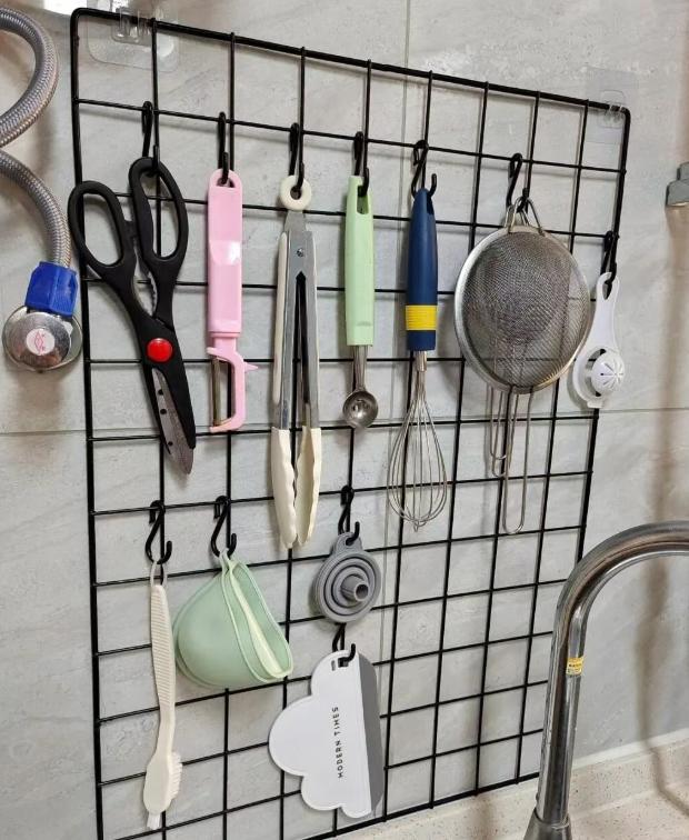 在墙上固定两个挂钩,再把网格片固定在挂钩上,平时可以在网格片上挂一些厨房用的小工具,收纳效果特别好,而且物品井井有条的。