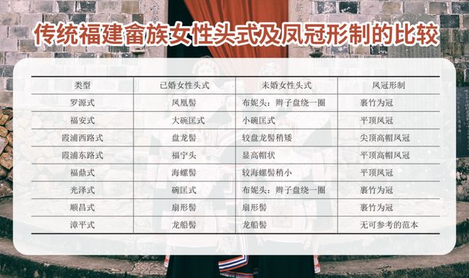 畲族妇女的发式称为“凤凰髻”,16岁前的少女用红绒缠辫子,盘绕头上,畲族称为“布妮头”。成年的已婚妇女发式畲族称为“山哈娜头”,这种发式也随地域不同而略有差异。还有流行于浙闽一带的“凤头髻”、流行于福安和宁德大部分区域的“凤身髻”,流行于福鼎和霞浦西路的“凤尾式”等。