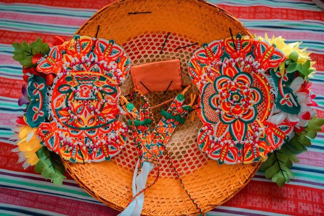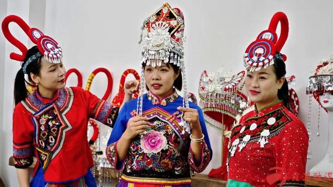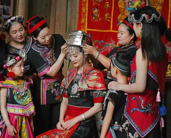 传统的凤冠由银钳栏、头面、银金、古文钱等精巧部件组成,仿佛一只凤凰在头顶翩翩起舞。已婚妇女头戴凤冠,红布包裹的竹管下悬着一条红绫,随风轻扬,宛如凤凰的尾羽。而少女们则用红色绒线将长发编成辫子,盘在头上,象征着凤头,青春洋溢。