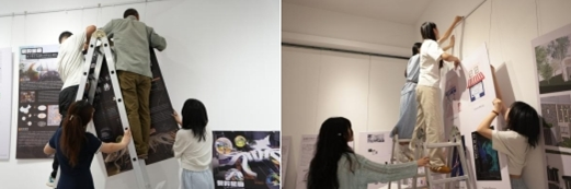 6月24日清晨,实践队师生便投入了紧张的忙碌。为迎接远道而来的国际伙伴,一场精心筹备的“2025国际设计教育交流展”正在紧锣密鼓的进行着。策展的主要指导老师周逸煊立于脚架之上,细致校准射灯角度,不时提醒队员:“角度再精确些,要让人一进门就被吸引。”
